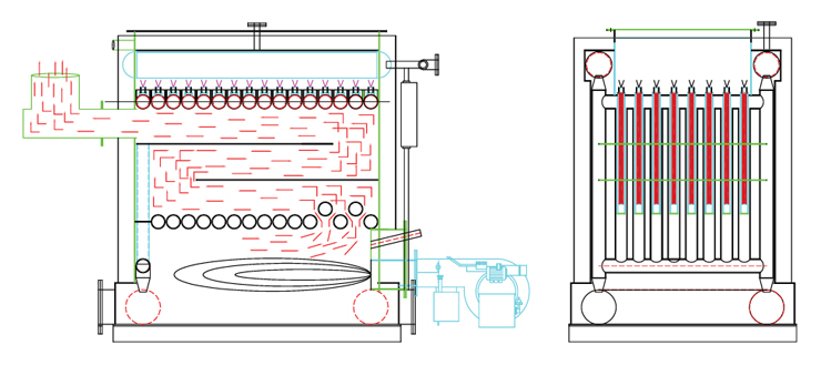 It is a multi-tube type two way boiler which can use gas or oil burner together with electricity